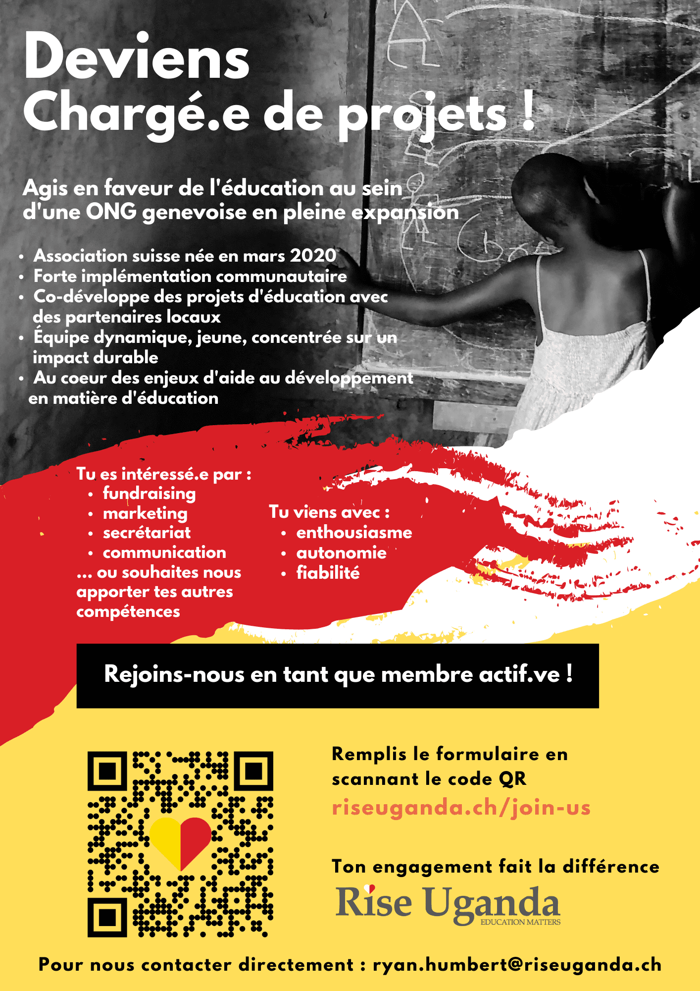 Wir arbeiten von Genf aus mit drei Organisationen zusammen, die in Kampala, Uganda, ansässig sind. Wenn du mehr über die Herausforderungen einer nachhaltigen und qualitativ hochwertigen Bildung erfahren, Erfahrungen im Projektmanagement sammeln und Teil eines jungen und dynamischen Teams werden möchtest, das sich auf die Wirkung bei bedürftigen Kindern konzentriert, dann komm als aktives Mitglied zu uns, um einen Unterschied zu machen!