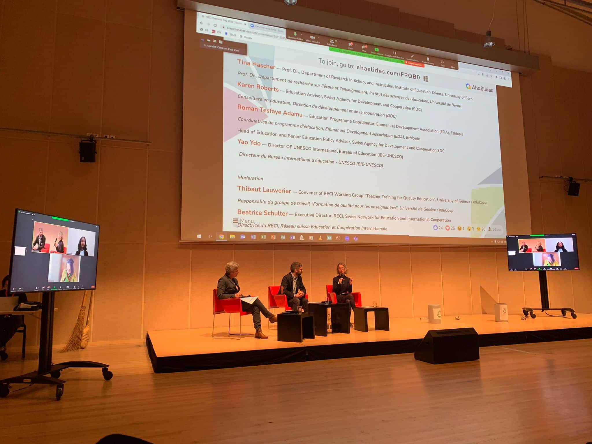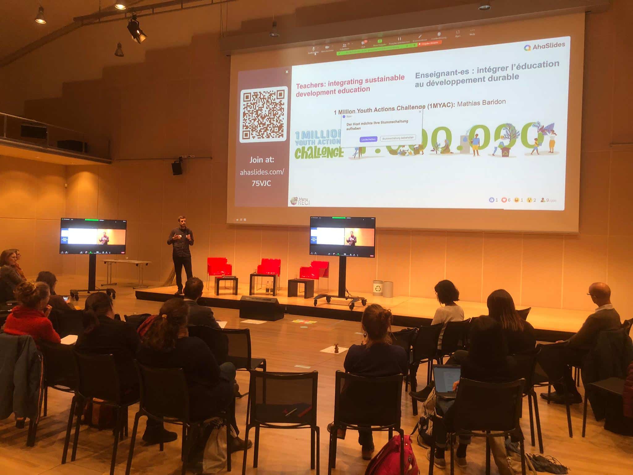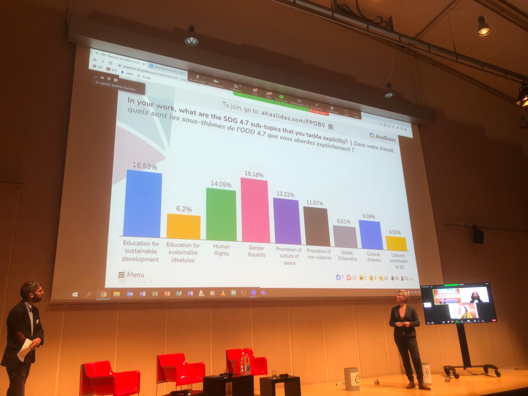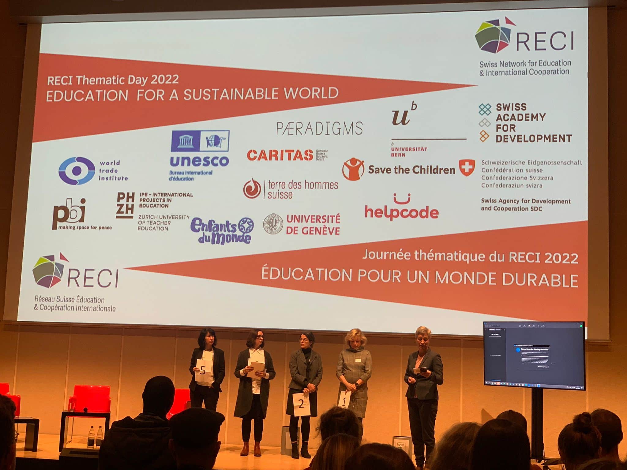 We are delighted about the great success of last November’s RECI Thematic Day on Education for a Sustainable World. Some 70 people took part in Bern at the Paul Klee Centre, and 50 people from more than 20 countries participated online. The participants enjoyed an inspiring debate with passionate speakers. Afterwards, they divided into different workshops, where they helped to shape and animate the discussions on current topics around Sustainable Development Goal (SDG) 4.7 and the interdependence between environment, human rights and education.