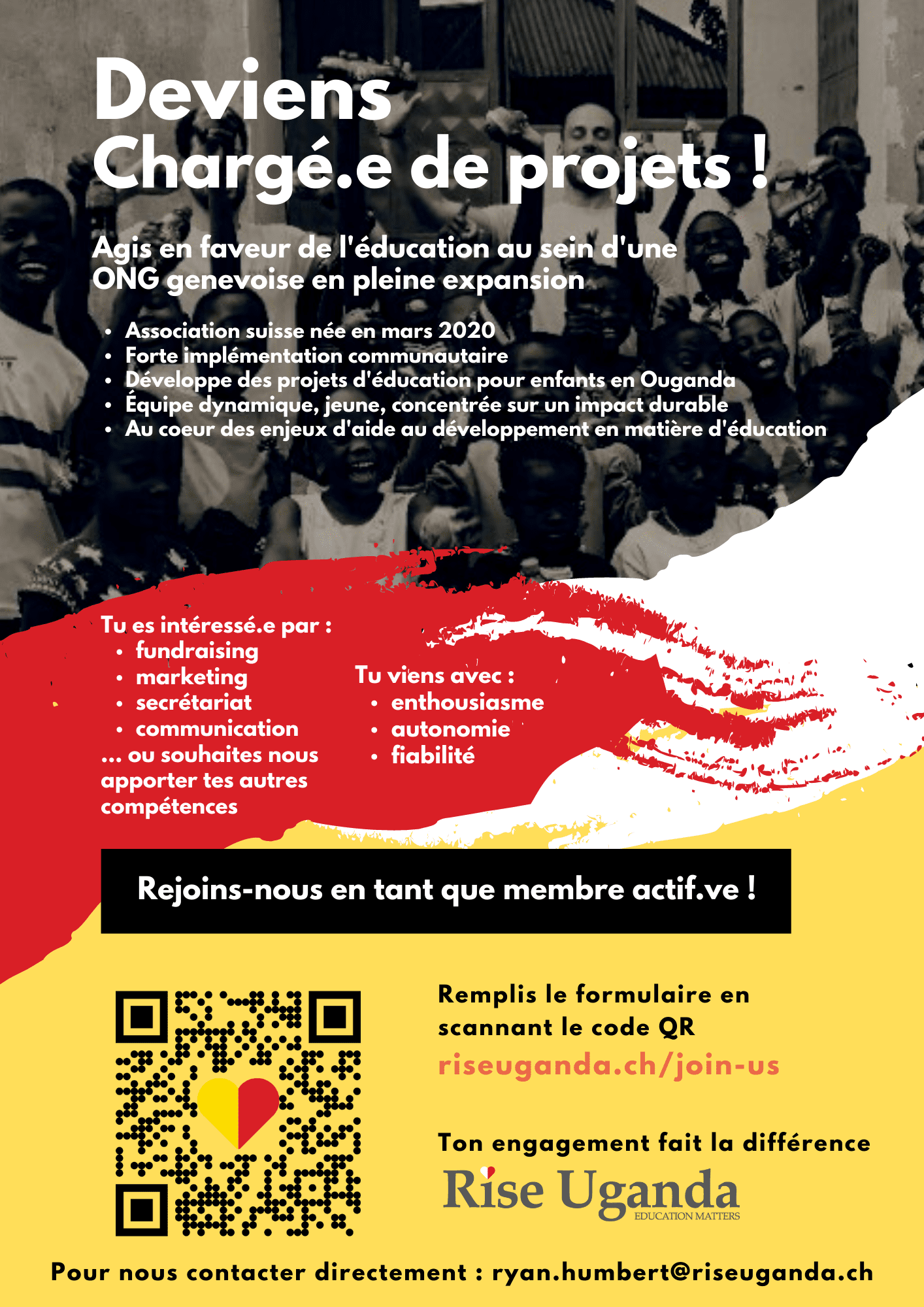 Nous travaillons depuis Genève en partenariat avec 3 organisations basées à Kampala en Ouganda. Si tu souhaites en savoir plus sur les défis liés à une éducation durable et de qualité, gagner de l’expérience en matière de gestion de projets tout en faisant partie d’une équipe jeune et dynamique focalisée sur l’impact auprès d’enfants dans le besoin; rejoins-nous en tant que membre actif.ve afin de faire une différence! »